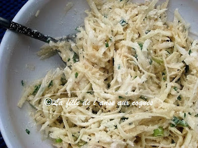 Je ne cuisine pas assez souvent avec le céleri-rave. Pas que je n'aime pas, mais tout simplement parce que je n'y pense pas. C'est grâce au chef Mario de mon épicerie locale que j'ai découvert cette recette qui met en valeur ce légume. La salade est toute simple, et c'est sa sauce qui fait la différence puisqu'elle allie fromage et citron. Le chef privilégie l'huile de noix pour cette sauce, mais si vous n'avez pas, une huile de votre choix fera aussi l'affaire. Cette petite sauce vient donner le ton à la salade. C'est particulièrement bon et goûteux. Je n'avais fait que que la moitié de la recette. Nous avons vidé le plat, et n'étions que deux.C'est vous dire!