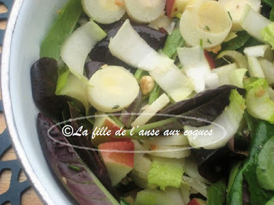 Cela fait quelque temps que je vous ai proposé une salade. J'en fais régulièrement, mais pas nécessairement de nouvelles. Je ne cuisine pas assez souvent avec les endives, et pourtant c'est délicieux. J'ai eu envie de les utiliser dans une petite salade pour deux. J'ai puisé mon inspiration ici pour la préparer, et pensé utiliser du jus de citron Meyer pour la vinaigrette. J'avais congelé les zeste et le jus de mes derniers citrons pour ne pas les perdre. Ce n'est pas obligatoire d'utiliser ceux-ci, mais vous devrez ajuster à la baisse la quantité de jus si vous utilisez du citron régulier. J'ai aussi mis à profit mon huile d'olive au citron mais si vous n'avez pas, n'utilisez que de l'huile d'olive régulière. Cette petite salade toute fraîche est simple à préparer, et franchement délicieuse.