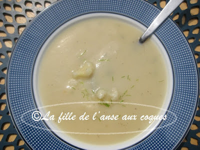 J'ai trouvé ici cette recette très classique de crème de chou-fleur. Je n'ai pas mis de crème par contre. Je n'en voyais pas la nécessité, mais si vous préférez en ajouter, cela donne davantage d'onctuosité. Au service, j'ai garni de quelques fleurons de chou-fleur et de ciboulette. Cette soupe est délicieuse, avec ou sans crème.