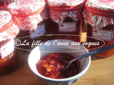 Je pensais bien en avoir fini avec la mise en conserve cette année hihi. Puis j'ai vu ici cette confiture de canneberges que je trouvais très festive. En fait, elle me faisait penser à Noël, et c'est ce qui a fait que je m'y suis remise. Et le résultat vient confirmer ce que je pensais. Visuellement, on dirait qu'elle est faite de fruits confits. Faut dire qu'elle ne contient pas que des canneberges mais aussi des oranges, des ananas et des abricots. On aurait pu la nommer bien différemment finalement hihi. Cette confiture contient de la pectine ce qui rend la préparation un peu moins longue, si ce n'est l'étape de hacher certains des fruits utilisés. Le rendement a été un peu plus important que je ne le prévoyais, et je ne m'en plaindrai certainement pas hihi. Faut dire que les oranges sans pépin achetées étaient vraiment très grosses. Cela a certainement joué sur la quantité obtenue. Cela fera plus de personnes à gâter tout simplement! Cela dit, cette confiture est un délicieux mélange fruité de saveurs. Cette confiture est excellente. Je pense que certains gourmands de la famille vont tout simplement adorer.